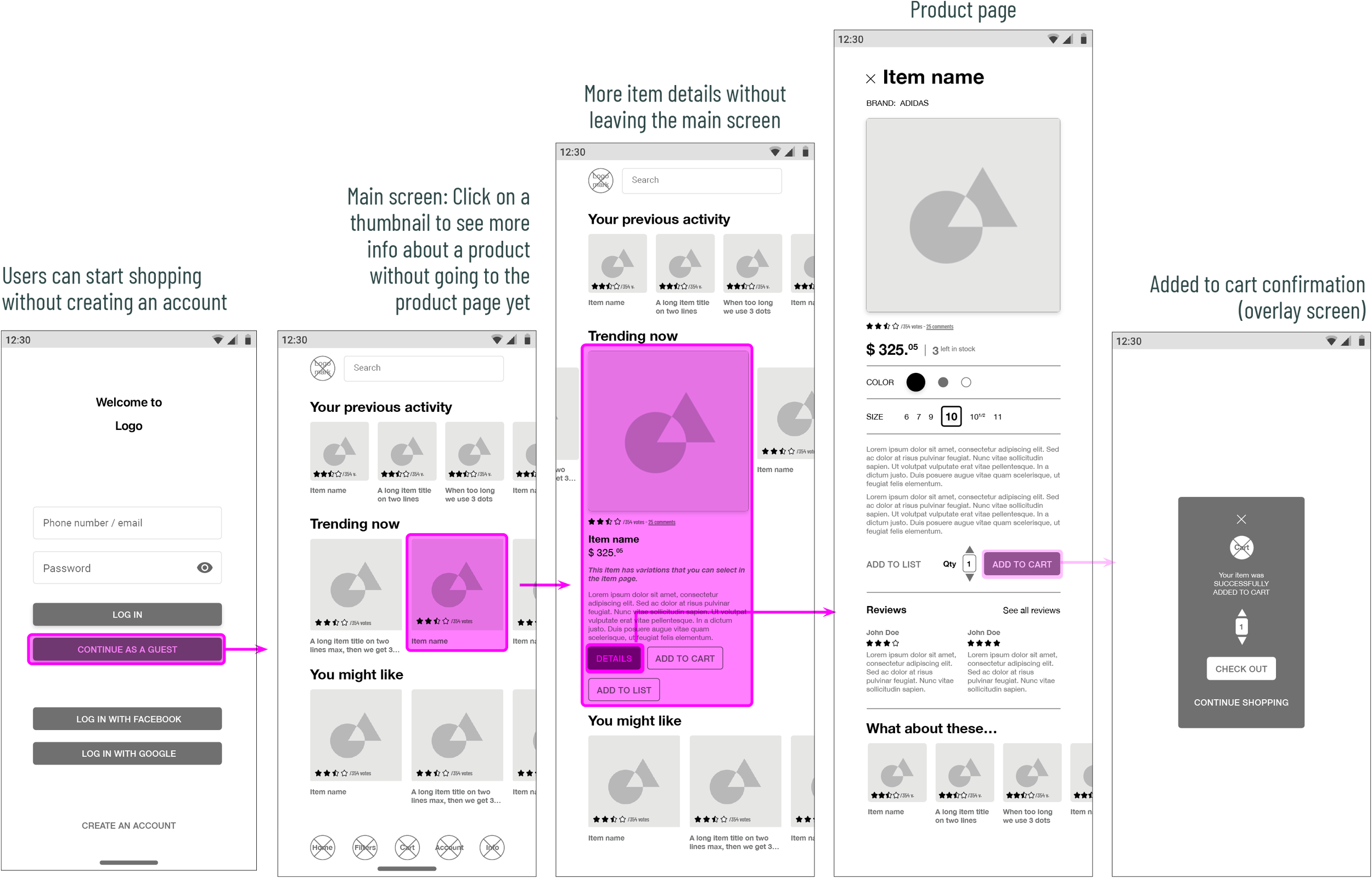 Early user test realised via video call on the mid fidelity version. Participants were asked to add an item to the cart, starting from the login screen. Here is an extract of their feedback.